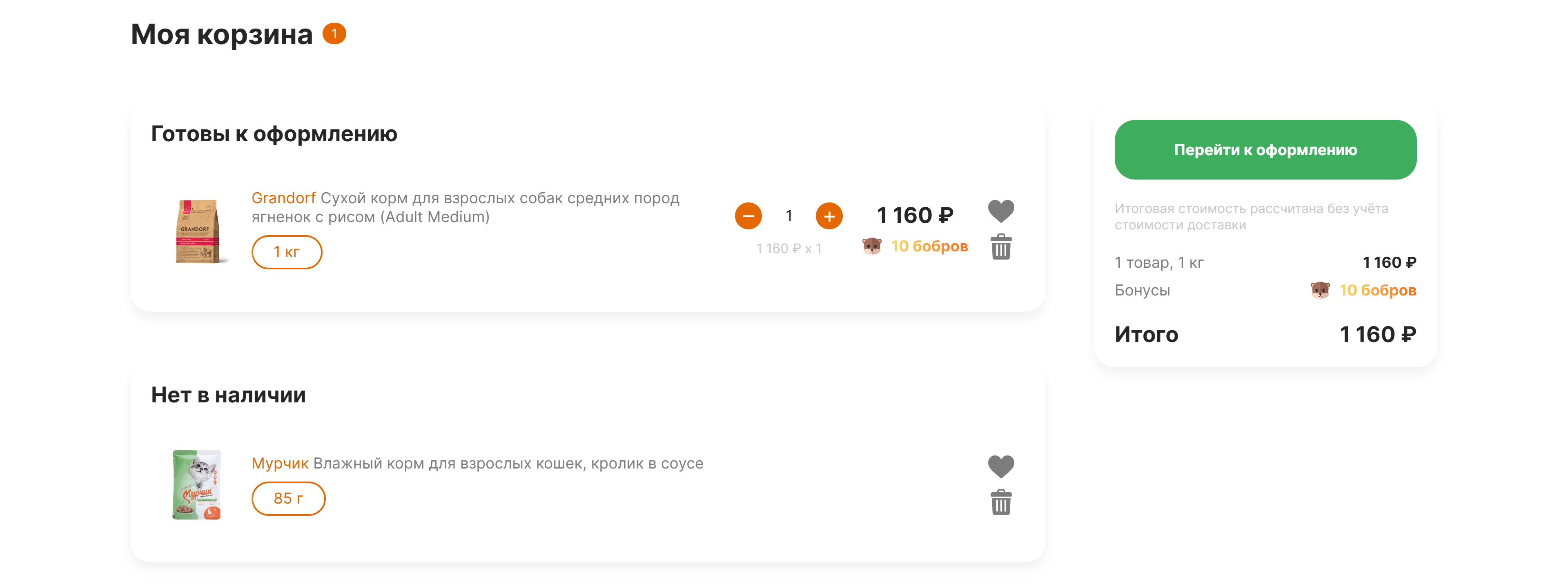 Интерфейс корзины включает детализированный расчет заказа: отображается общая стоимость, суммарный вес товаров и