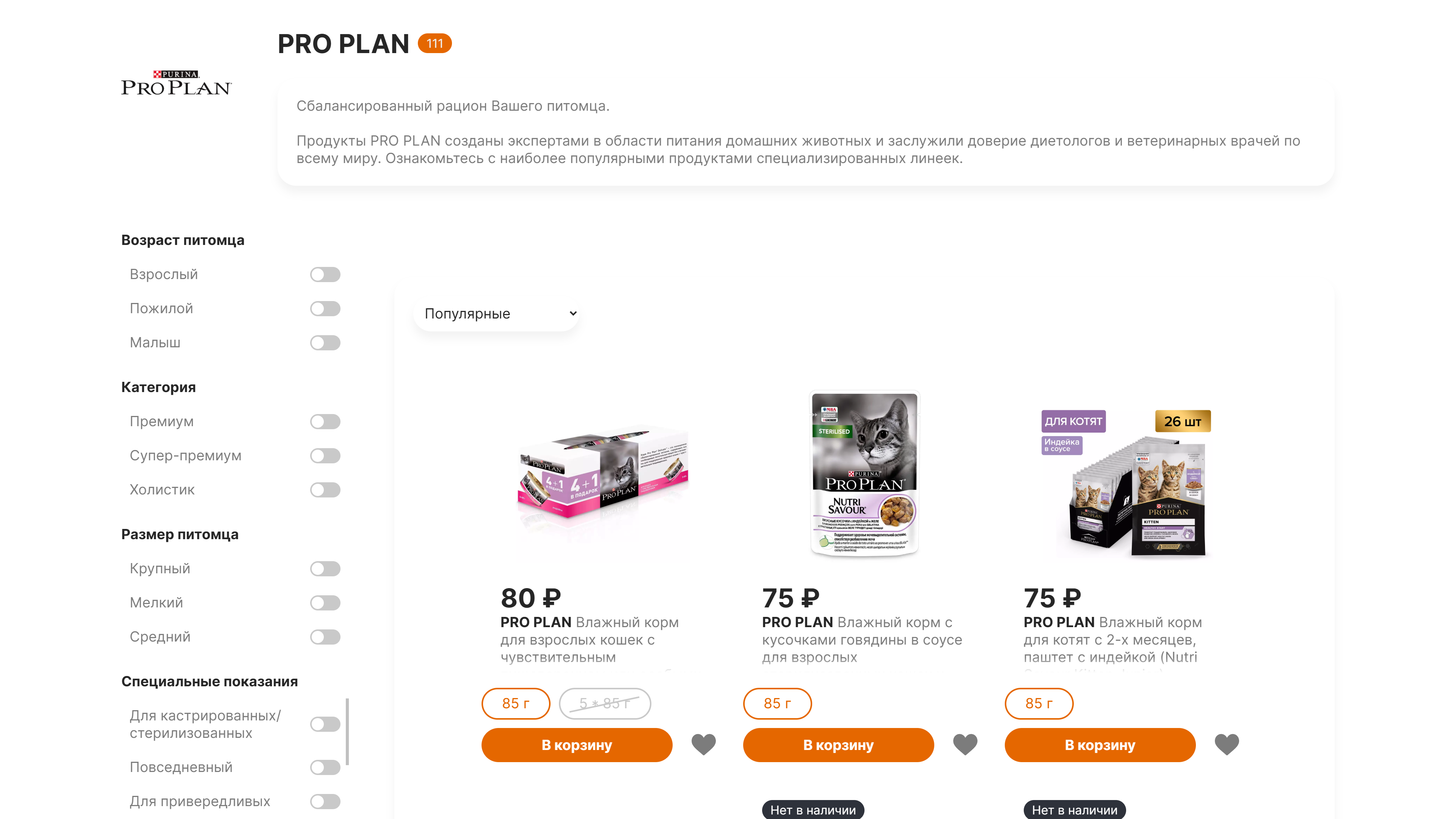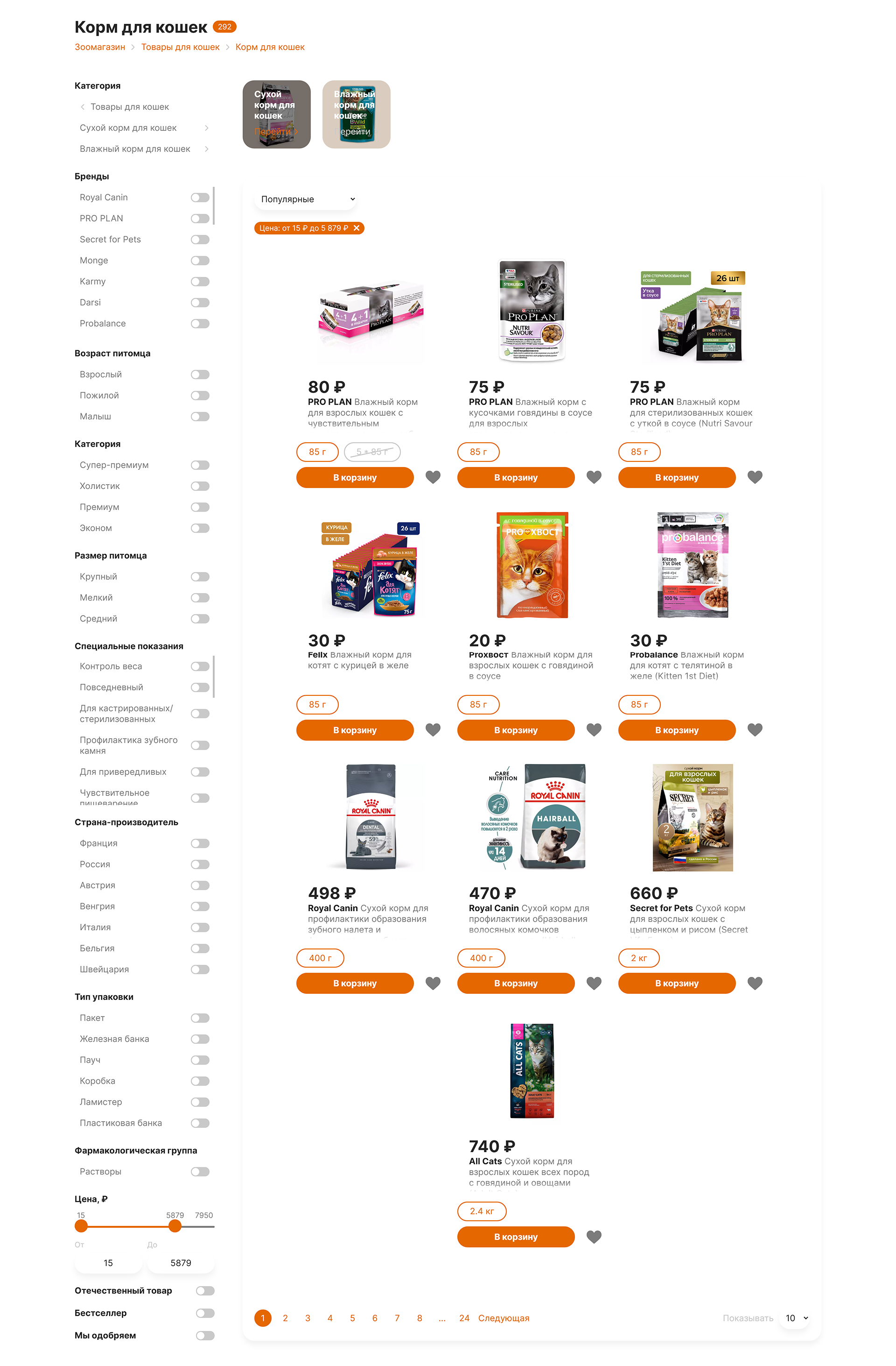 категориям товаров – корма, игрушки, аксессуары, средства ухода и ветаптека.