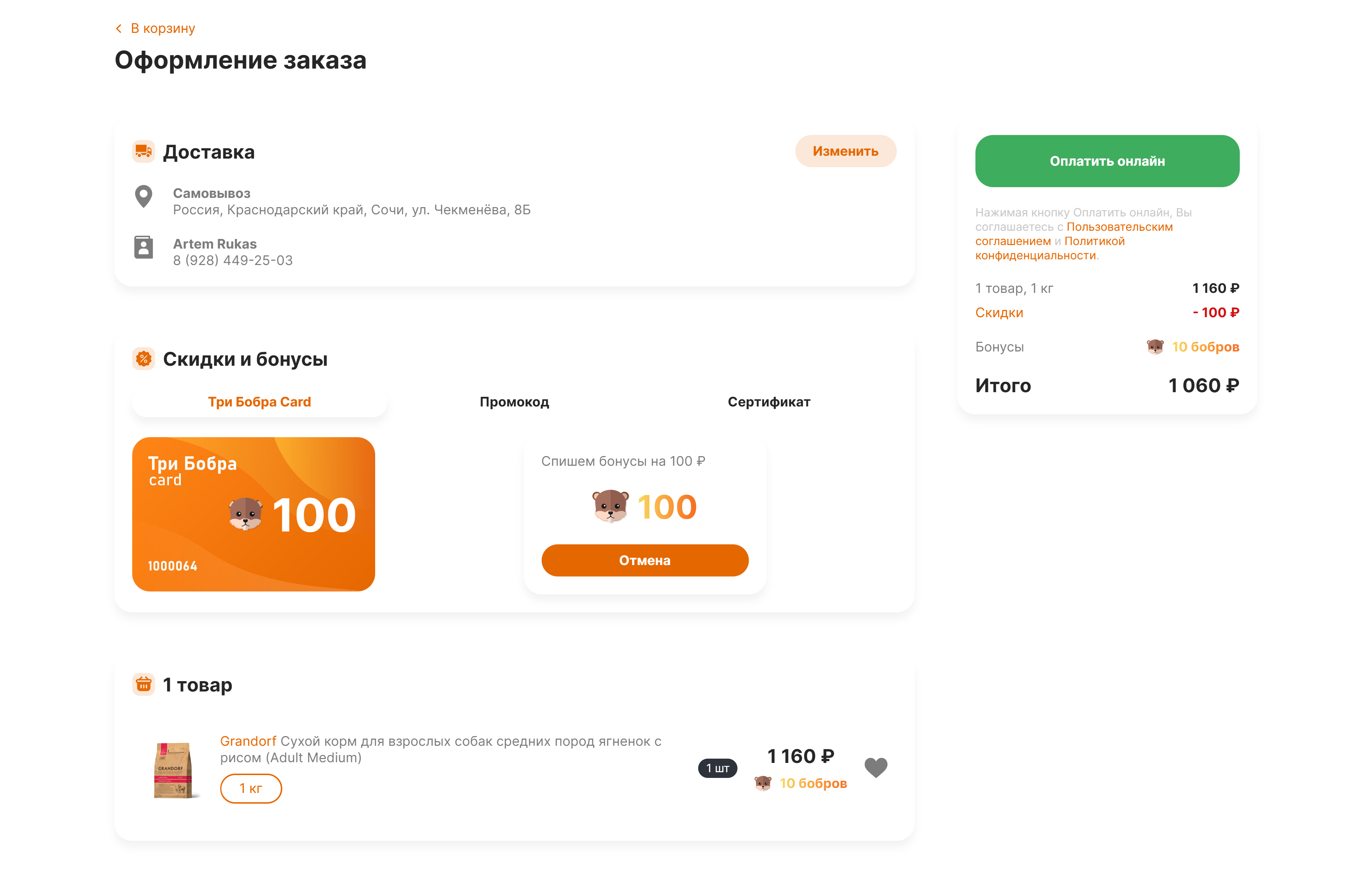 карта для списания накопленных баллов, применить промокод для получения скидки на заказ или