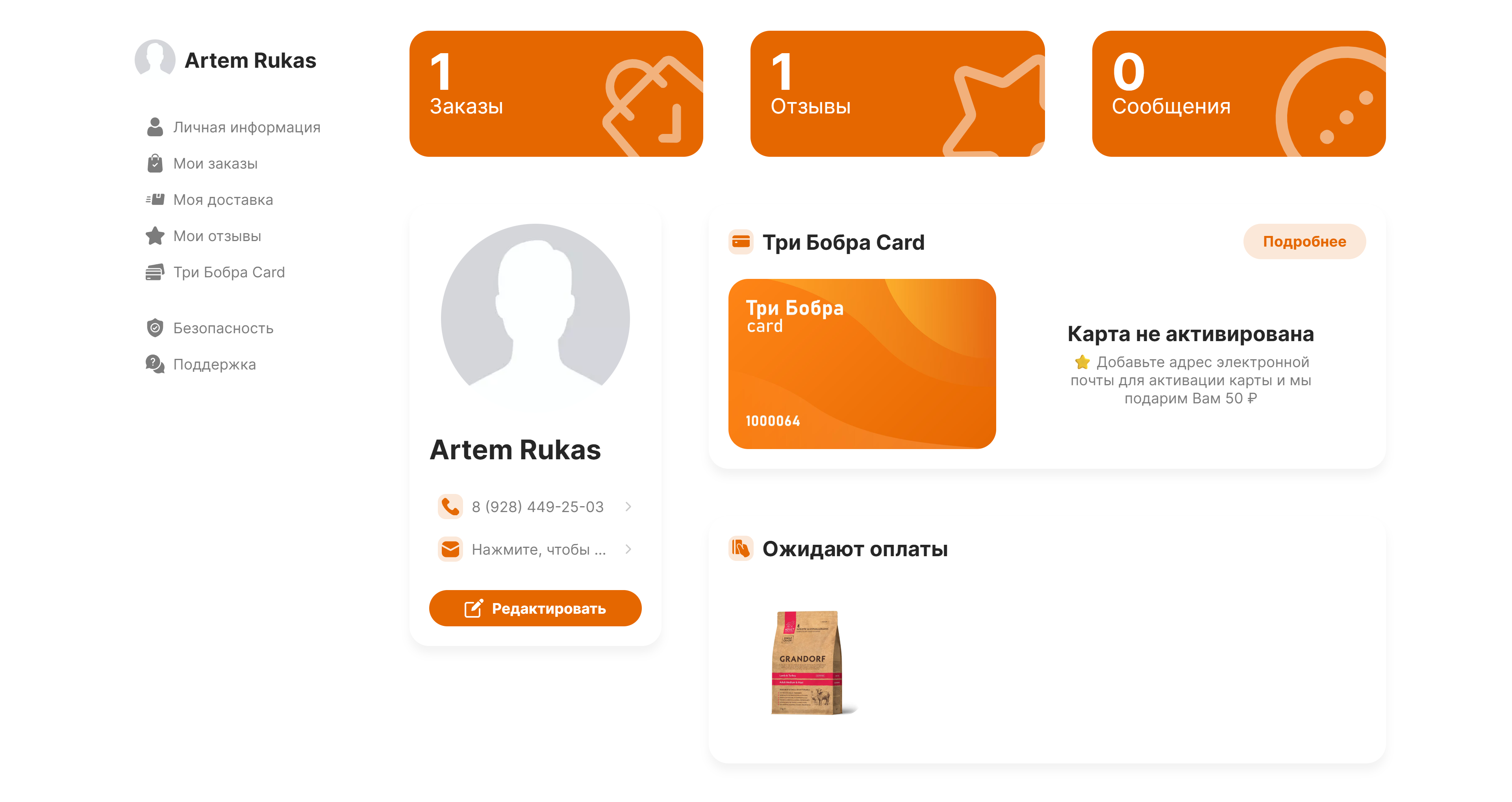 Верхняя часть страницы содержит ключевые показатели активности: количество заказов, оставленных отзывов и