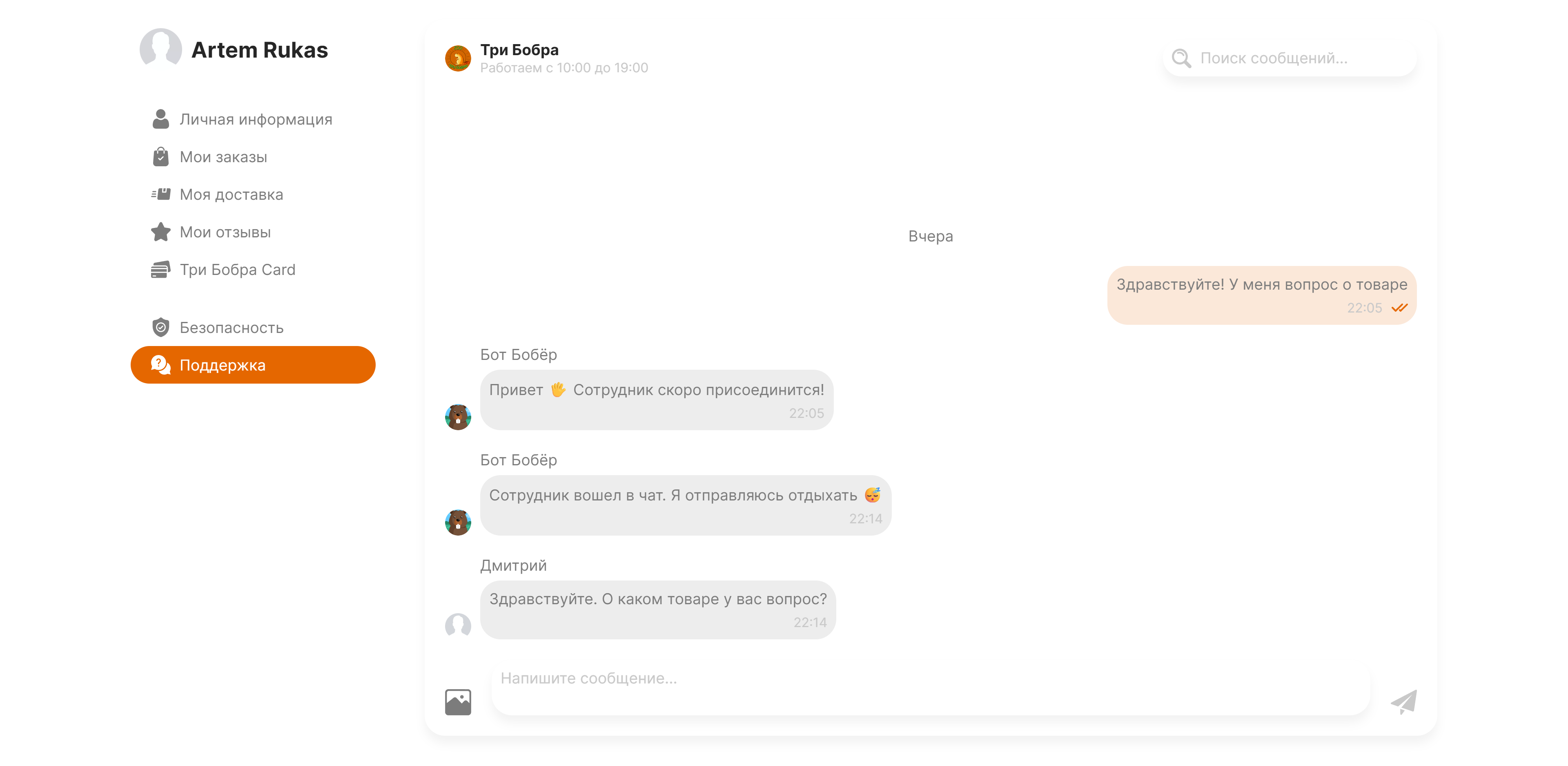 возможностях службы поддержки. Бот работает по принципу первичного фильтра, собирая основную информацию о запросе.