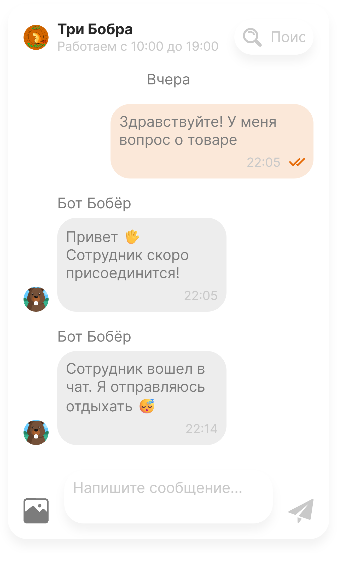 В момент подключения живого оператора к диалогу бот автоматически отключается, обеспечивая плавный переход к